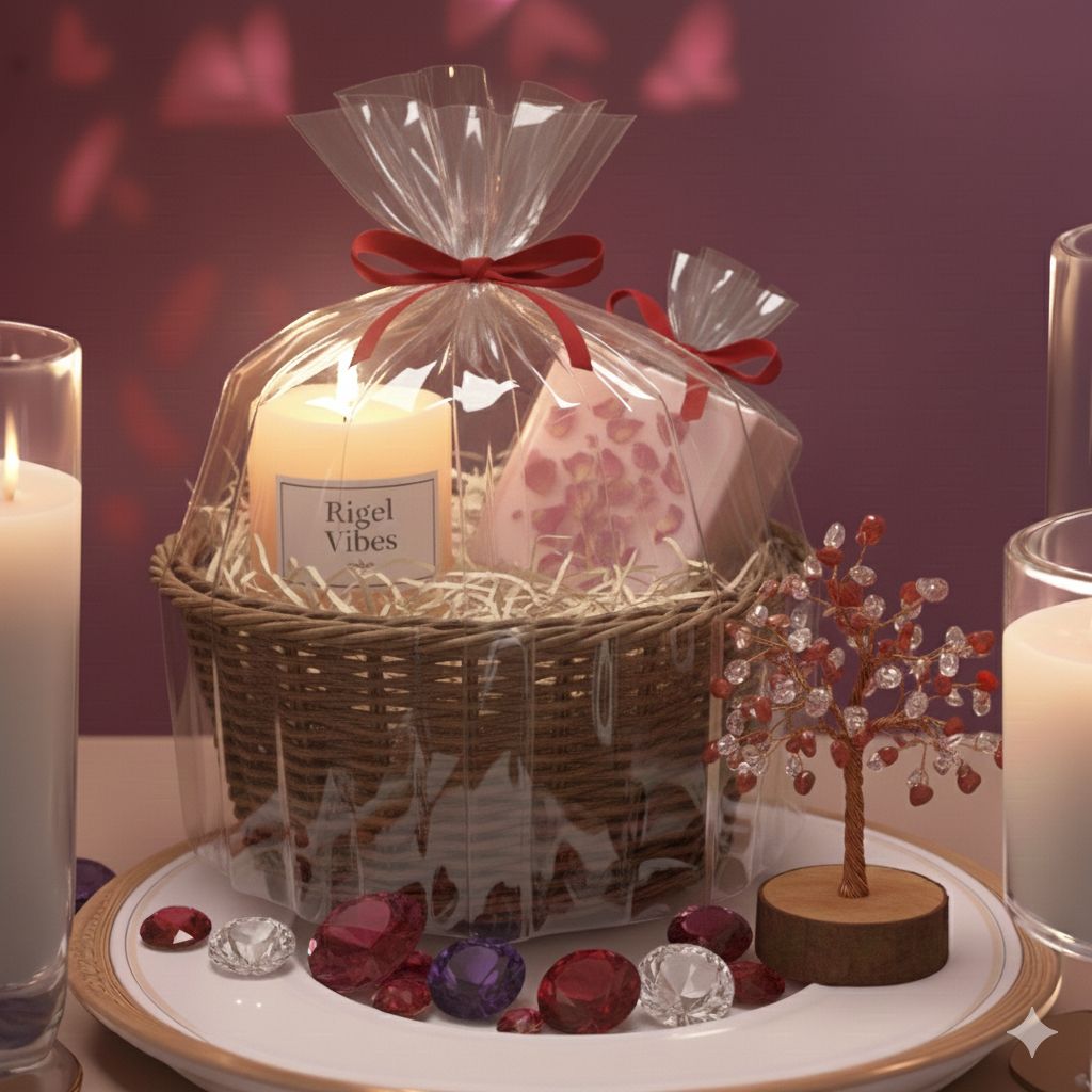 * Scented Candle: A glass jar candle with a wooden lid features a "Rigel Vibes" label.