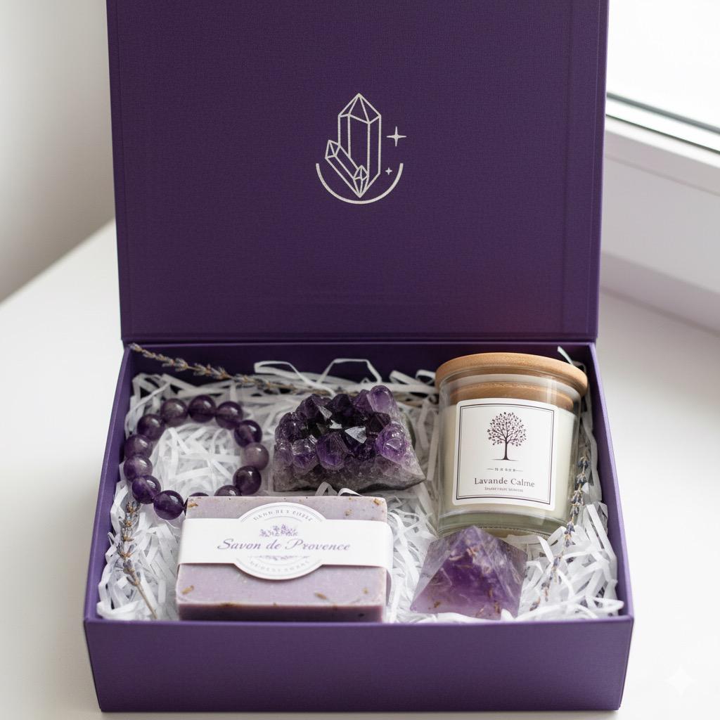 This purple-themed Rigel Vibes gift set is presented in a deep purple box and includes several items focused on relaxation and crystal energy: